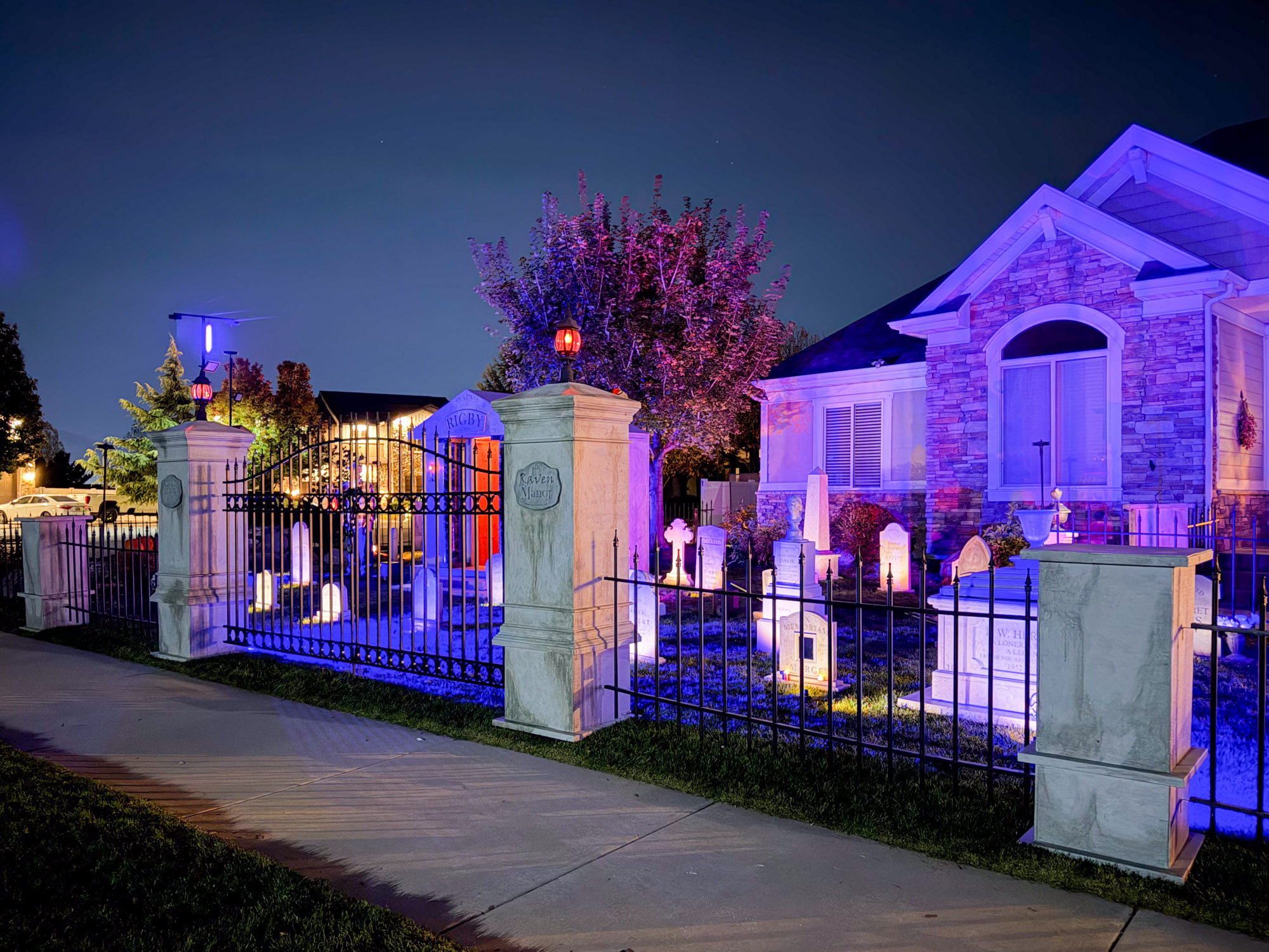 2017 was another nice weather year. Sunny and mild days from setup through Halloween and takedown the next day. High 50s to lower 40s at night. Everything ran really well too- the Axworthy ghosts went without a hitch and we had fog again after replacing the pump in my VEI V-950 fog machine. We added 6 tombstones this year, along with Lewis our skeleton grave popper, and the Jack-O-Lantern Jamboree from AtmosFX. The animated Jack-O-Lanterns were a big hit. Raven Manor even got a small spot on our local ABC morning show "Good Things Utah". It's always fun to share with more people. Thanks for the fantastic year!