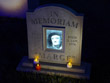 I had no plans to do anything new for 2010... until about 2 weeks before Halloween when I decided to build 5 new tombstones and a grave slab for the side yard. The cemetery now has 20 handmade tombstones, plus the Leota grave slab and Rigby Mausoleum. The Leota name on the grave slab, as well as the W.E.D. (Walt Elias Disney) tombstone are both respectful nods to Disney and the Haunted Mansion who were a large inspiration to create as I do. Thank you Walt for the fascination and enjoyment you have brought to so many. I also modified the pulley for the floating lantern to one with ball bearings and it worked great and was silent and smooth all 3 nights for the lantern. Some new tracks were added to the soundtrack. I really like the haunting sound produced by the harp and chorus, it just seems to fit our elegant ghost movements and theme. We were pushing our luck after so many dry years in a row. The 2 days prior to setup gave me 3-4 inches of snow on the ground. Luckily by setup day (Thursday Oct. 28th) the weather cleared and warmed some with both setup days being dry and in the 60s F. The first night we opened it was mild and nice. The next day on Satuday I replaced the wooden fence posts up the side of the yard with conduit poles mounted in the ground that I could attach/remove the upper fence posts from each year. It was cloudy all day and started to rain in the early afternoon. Trick or treat night on Saturday was quite windy and a steady rain, but it cleared fairly well after 7:30 pm. Sunday the 31st was clear and dry. High temps were 57, low 35, with it getting down to about 47 F while we were open at night.