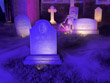 Another year with snow on the cemetery. We decided to cut from 4 operating nights to just 3 and Raven Manor was open Friday October 29th - Sunday October 31st and we had excellent weather on Saturday when the trick-or-treaters came. We also had the local news KUTV-CBS stop by for a live segment Saturday night so we stayed open after 10 pm for that. The first two nights were dry but Sunday was the 2nd straight Halloween that we were covered in snow. The winds picked up a bit and the snow continued to come down during the night, but the display ran through it all. New this year was a larger fog machine (a VEI V-950). I run it inside the mausoleum with an ABS pipe fog chiller and distribution system that takes the fog out into the cemetery. The fog worked rather well, paticularly Friday and Saturday night when the winds were pretty mild.