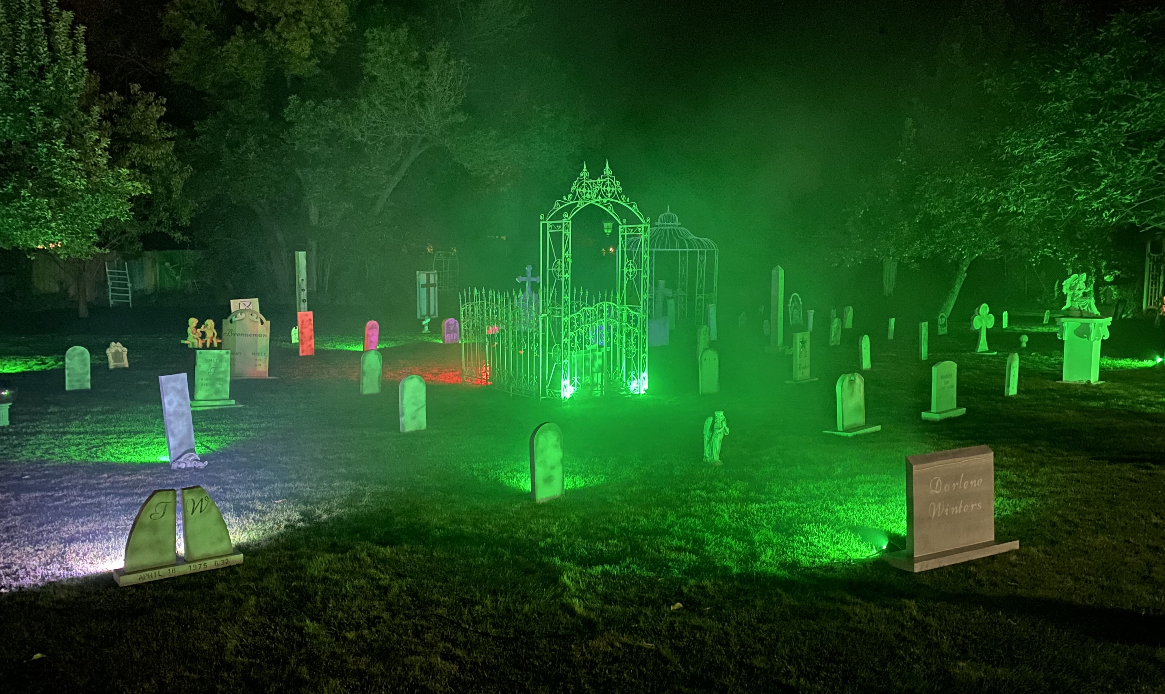 2395 W 12600 S This is a homemade cemetery display that is impressive by the number of handmade tombstones and its size! Spooky lighting and fog fills this cemetery that awaits you, right on the main road of 12600 South (south side of the road).