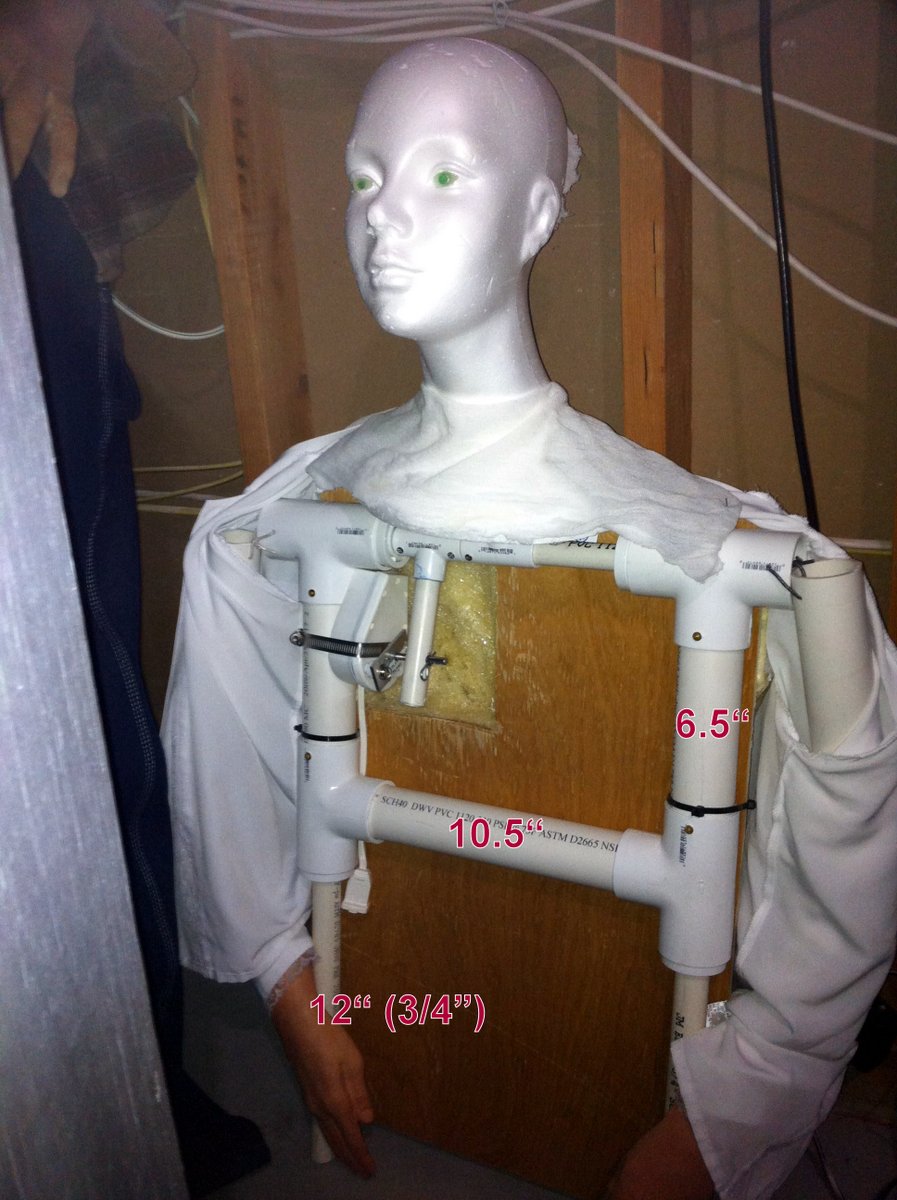 The dimensions shown in the photo are cut lengths, so the finished length between the tees is smaller (9" of the 10.5" piece show, and 5" of the 6.5" piece). The overall width of the verticle pieces is 16". The overall width of the two shoulder tees is 18 1/4". The arms are hung with some 12 guage romex wire. The 1/2" tee for the head and neck was centered. Small screws were installed to hold all the pieces together. |